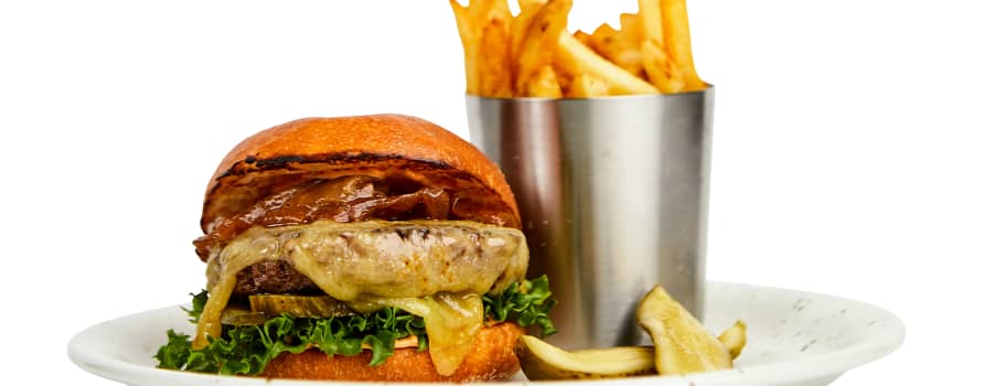 Burgare med hamburgerdressing, dubbel cheddarost, krispsallad, pickles och karamelliserad lök.