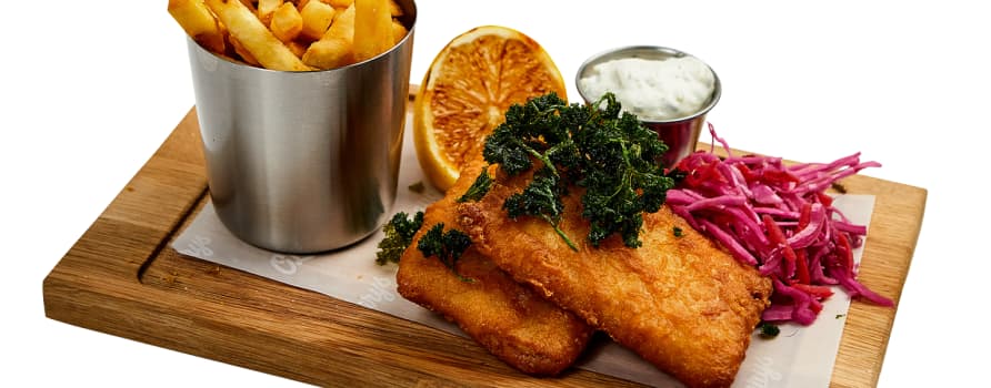 Frasigt friterad torskfilé som toppas med friterad persilja. Serveras med tartarsås, grillad citron, jalapeñopicklad slaw och pommes frites.