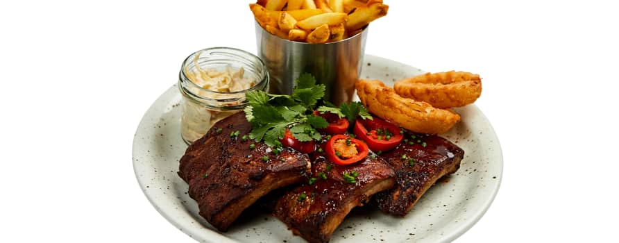 Saftiga baby back ribs glaserade med O'Learys signature BBQ-sås som toppas med picklad jalapeño, koriander och gräslök. Serveras med pommes frites, friterade lökringar och coleslaw.
