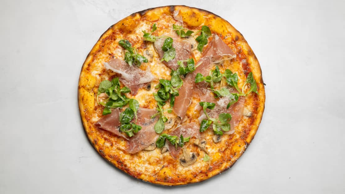 Tomatsås, mozzarella, prosciutto & champinjoner