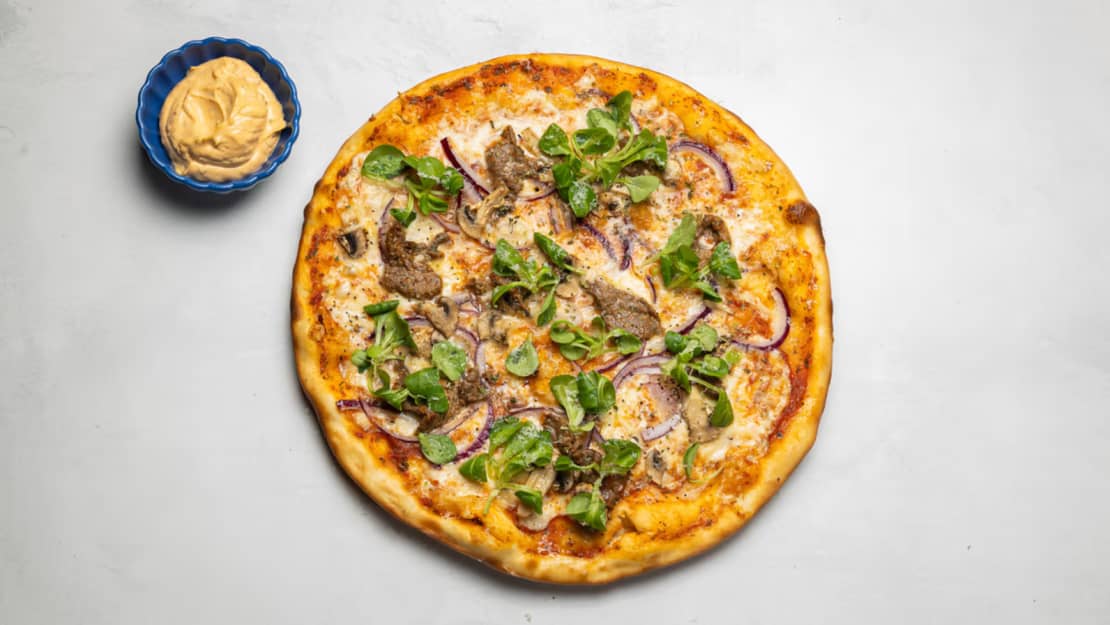 Tomatsås, mozzarella, oxfilé, champinjoner, rödlök & chillibea