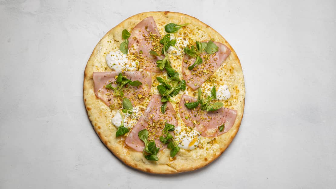 Crème fraîche, mozzarella, mortadella & pistagenötter
