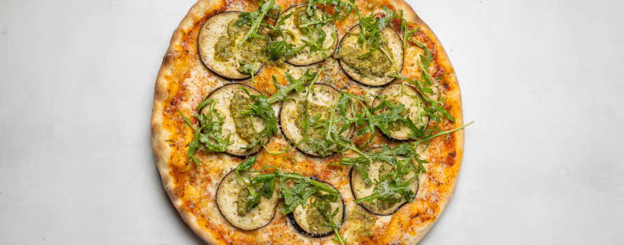 Tomatsås, mozzarella, aubergine & pesto
