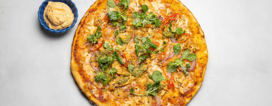 Tomatsås, mozzarella, kyckling, rödlök, pesto & chili