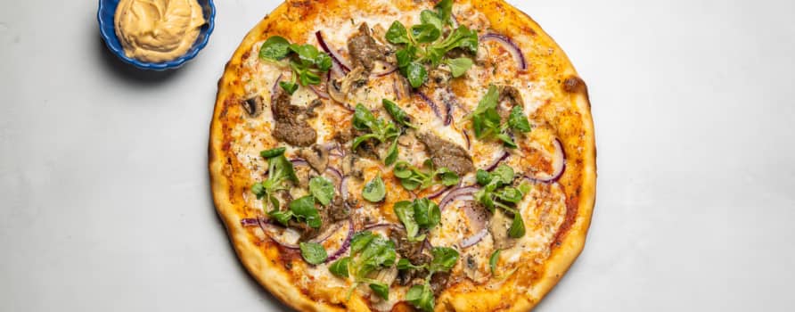 Tomatsås, mozzarella, oxfilé, champinjoner, rödlök & chillibea
