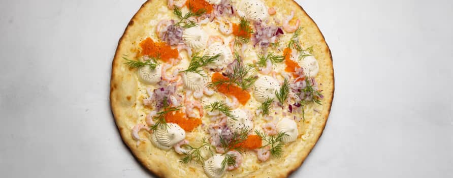 Crème fraîche, mozzarella, räkor, tångrom, rödlök & dill