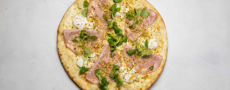 Crème fraîche, mozzarella, mortadella & pistagenötter