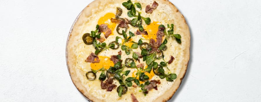 Crème fraîche, Mozzarella, Cheddarost, Bacon & Jalapenos