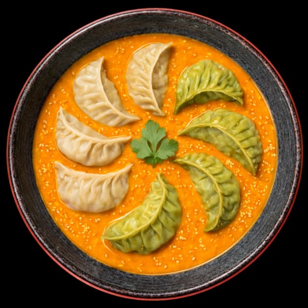 Nepal's Favorite, juicy steamed Momo in a rich, comforting, spiced soybean and sesame-based soup. Served with a side of tangy Aaloo Sadeko (Potato salad), and house hot sauce. This option if you want a mix of momo filling