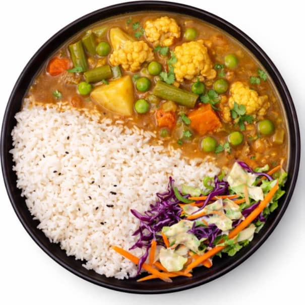 A flavorful vegetarian twist on Nepali dal bhat — savory Nepali-style vegetable curry over warm Basmati rice. Served with spicy and tangy Aalu Sadeko for a perfectly filling lunch.