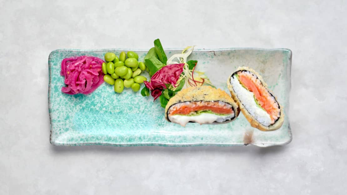 Friterad sushi burgare med lax, räka, avokado, färskost, toppas med chilimayo, teriyakisås, gräslök. (går inte att beställa glutenfri)