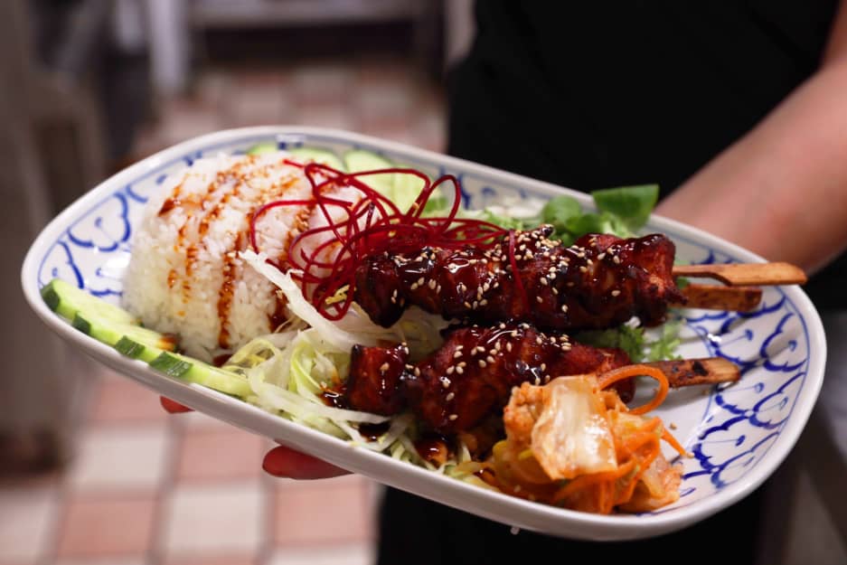 Kyckling spett med yakitori sås, serveras med ris och mix salad. Om ni har allergiska så kan säga till oss.