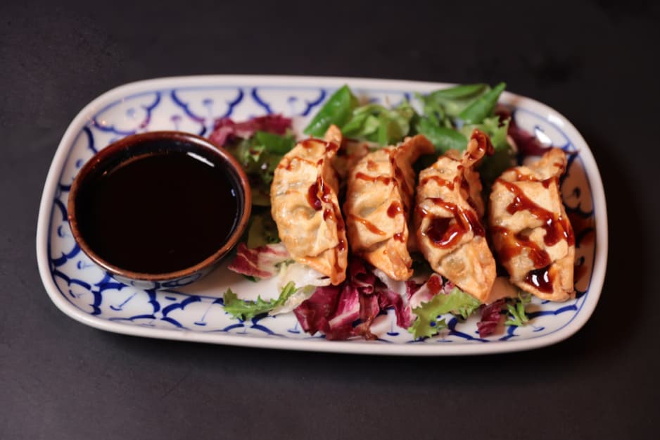 Friterade dumplings – Krispiga degknyten fyllda med vegetariska ingredienser (4st). Serveras med dippsås.